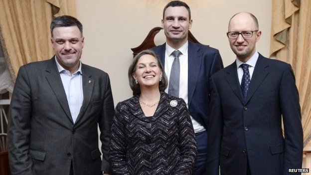 2014; Arseniy Yatsenyuk (right), Nuland (centre) leader of the Neo-Nazi Svoboda party. Oleh Tyahnybok (left)